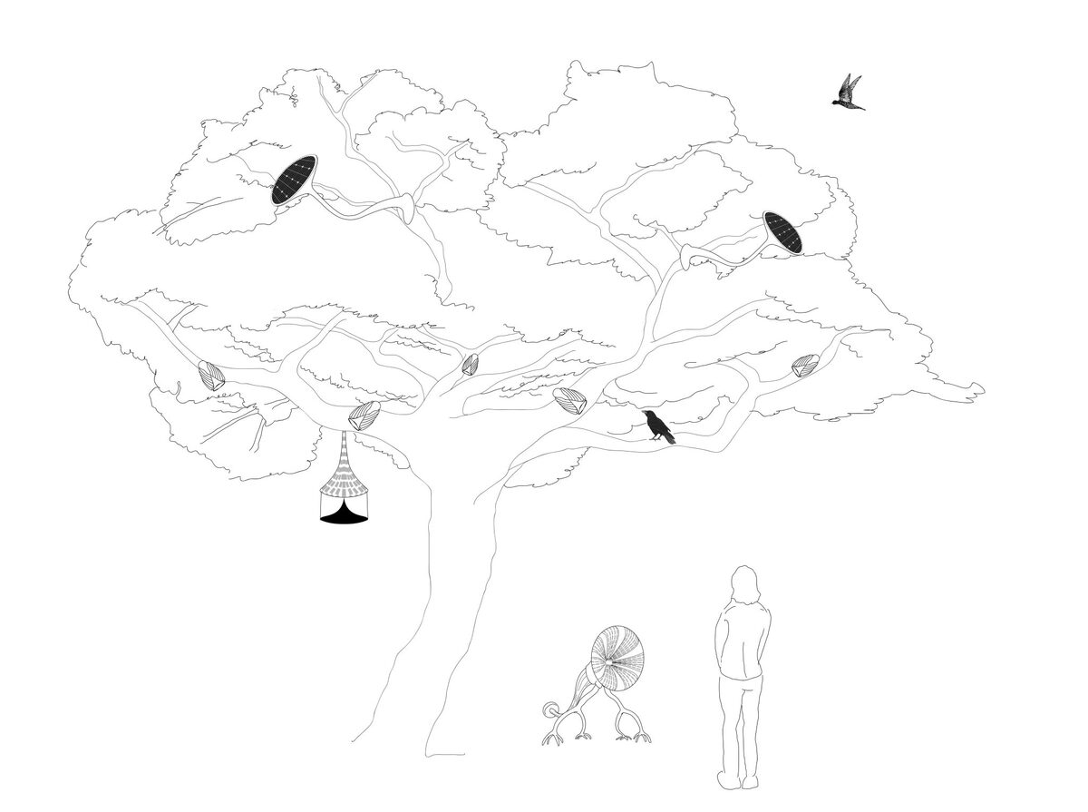 This spring, the Chorusing Symbionts will settle in the trees around the Glass House in the Amstelpark. Who are they? Artificial creatures created by artist Matteo Marangoni that reside high in the trees around the Glass House.