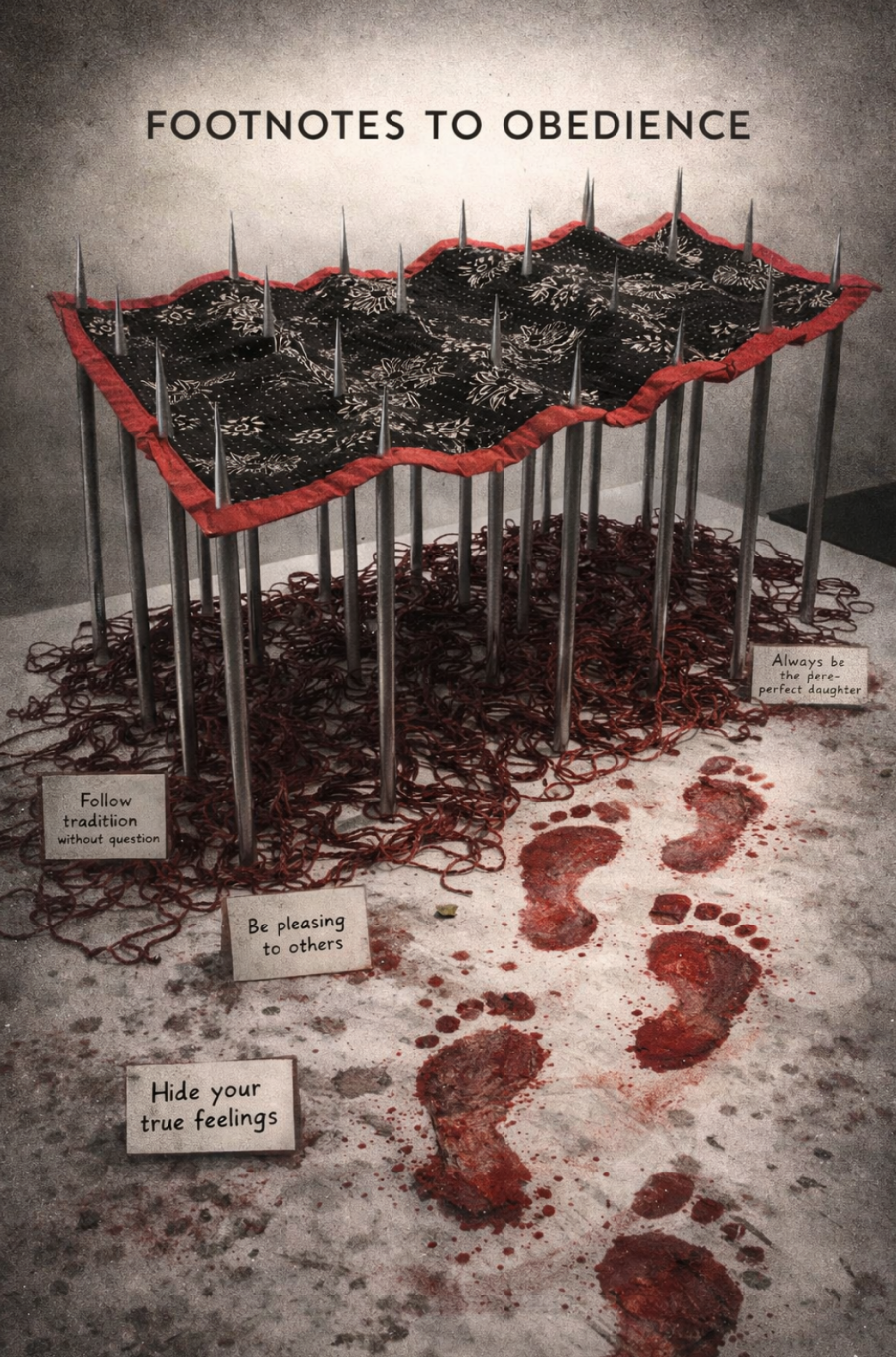 As part of the Opening Night for our show, ‘Choreographies of Compliance: Between Allowance and Acceptance’, we’re thrilled to bring you a very special interactive performance. Inspired by the Indian ritual of marking a home entry withkumkumfootprintsthis performance reframes a gesture of transition into a site of dissent. Participants are invited to create their own pugmark while recording a social or cultural rule they find difficult to follow. This act collapses private struggle into a collective archive of resistance where the gallery floor, draped with a sari, becomes a shared testimony. Participation functions as a performative unlearning of inherited norms and the weight they leave behind. Join us at the threshold for this opening night ritual of negotiation and reflection.